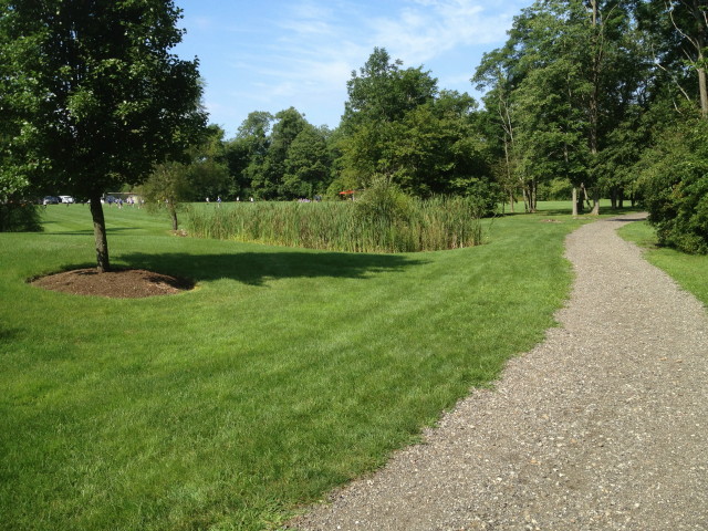 The jogging trail winds throughout the property in a 3/4 mile loop. The trail is 6 feet wide. Along the trail are several examples of native Ohio trees and vegetation. Each year tree identifiers are placed along the trail to enhance educational experiences of our many visitors. The trail is covered with a soft natural crushed rock surface.